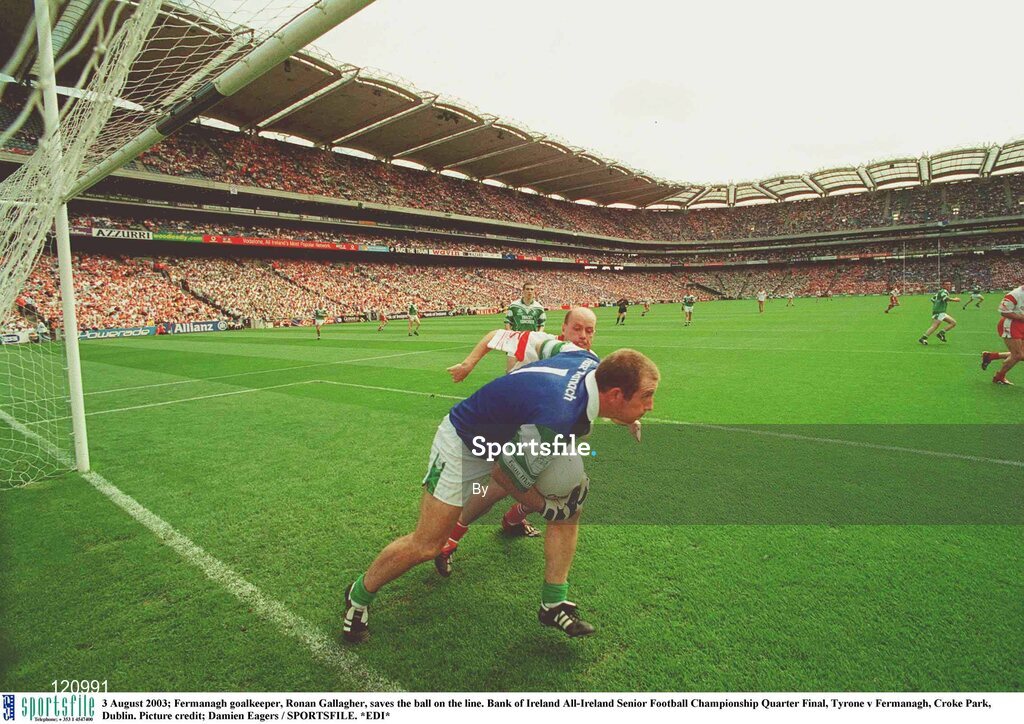 3 August 2003; Fermanagh goalkeeper, Ronan Gallagher, saves the ball on the line. Bank of Ireland All-Ireland Senior Football Championship Quarter Final, Tyrone v Fermanagh, Croke Park, Dublin. Picture credit; Damien Eagers / SPORTSFILE. *EDI*