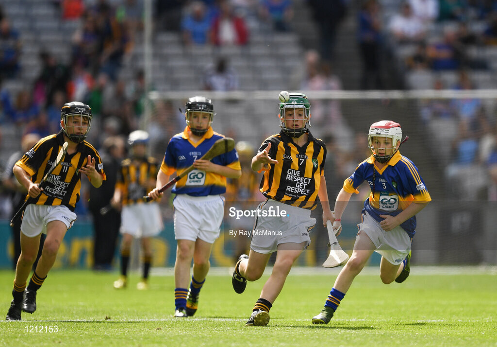 4 September 2016; Mark Holohan, Scoil Naomh Feichin, Termonfechin, Louth, representing Kilkenny, in action against Eamon Cassidy, St Brigids, Maghera, Derry, representing Tipperary, during the Go Games during the GAA Hurling All-Ireland Senior Championship Final match between Kilkenny and Tipperary at Croke Park in Dublin. Photo by Ray McManus/Sportsfile