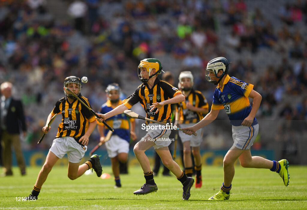4 September 2016; Edward Greene Harney, Monamolin NS, Gorey, Wexford, representing Kilkenny, and Pádraig Lennon, Scoil Chiaran Naofa, Stoneyford, Kilkenny, left, in action against Séamus Kennedy of Tipperary during the Go Games during the GAA Hurling All-Ireland Senior Championship Final match between Kilkenny and Tipperary at Croke Park in Dublin. Photo by Ray McManus/Sportsfile