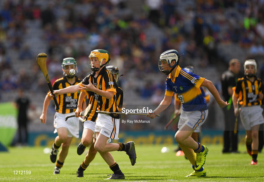 4 September 2016; Edward Greene Harney, Monamolin NS, Gorey, Wexford, representing Kilkenny, in action against Séamus Kennedy of Tipperary during the Go Games during the GAA Hurling All-Ireland Senior Championship Final match between Kilkenny and Tipperary at Croke Park in Dublin. Photo by Ray McManus/Sportsfile