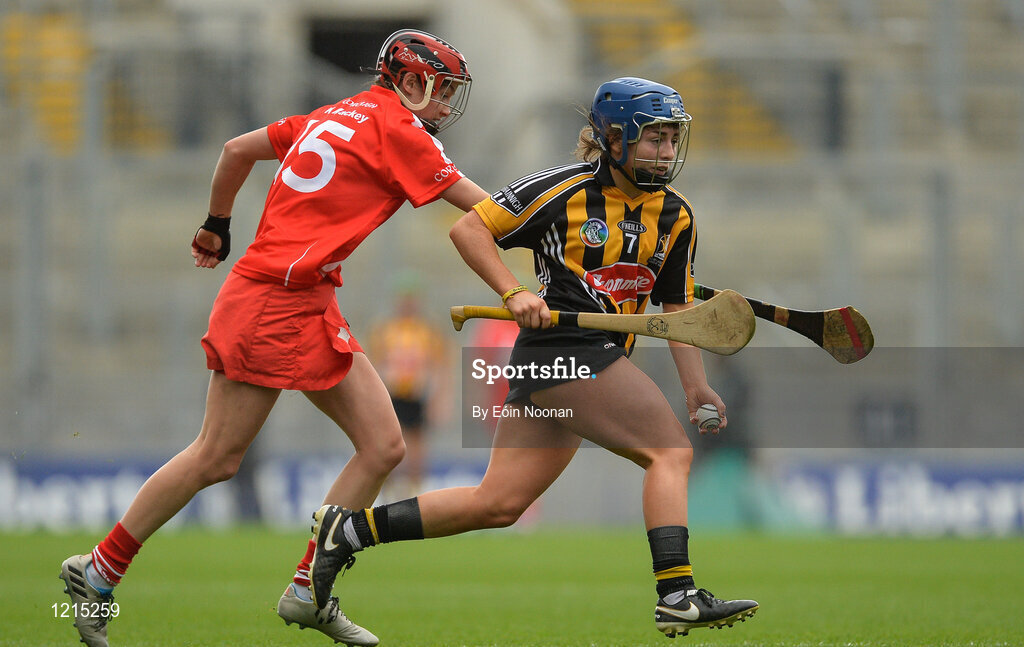 11 September 2016; Meighan Farrell of Kilkenny in action against Katriona Mackey of Cork during the Liberty Insurance All-Ireland Senior Camogie Championship Final match between Cork and Kilkenny at Croke Park in Dublin. Photo by Eóin Noonan/Sportsfile