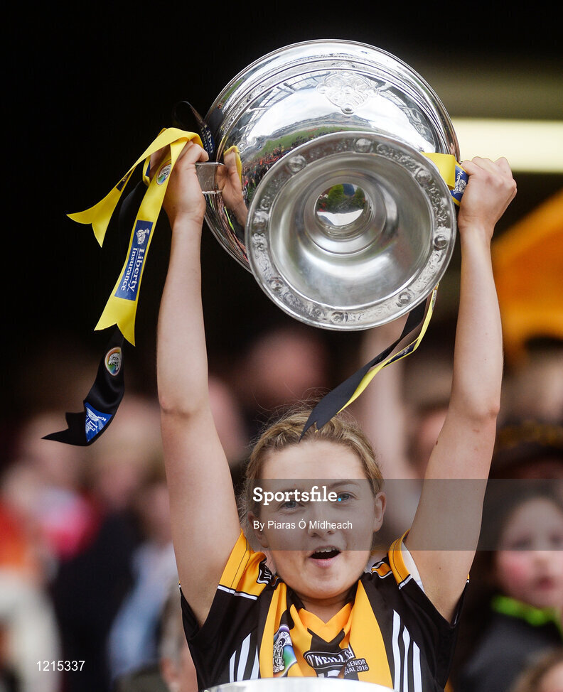 11 September 2016; Michelle Quilty of Kilkenny lifts the O'Duffy Cup after the Liberty Insurance All-Ireland Senior Camogie Championship Final match between Cork and Kilkenny at Croke Park in Dublin. Photo by Piaras Ó Mídheach/Sportsfile