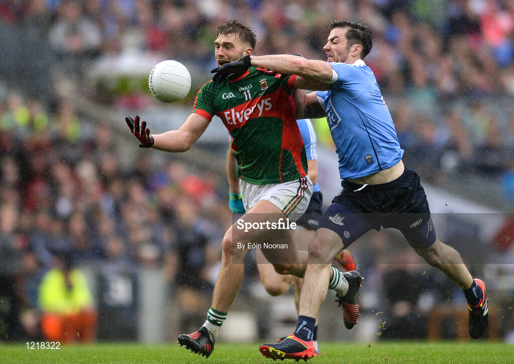 18 September 2016; Aidan O'Shea of Mayo in action against Michael Darragh Macauley of Dublin during the GAA Football All-Ireland Senior Championship Final match between Dublin and Mayo at Croke Park in Dublin. Photo by Eóin Noonan/Sportsfile