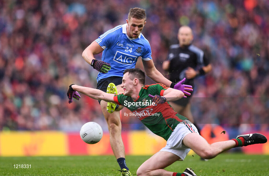 18 September 2016; Paul Mannion of Dublin in action against Diarmuid O'Connor of Mayo of Mayo during the GAA Football All-Ireland Senior Championship Final match between Dublin and Mayo at Croke Park in Dublin. Photo by Stephen McCarthy/Sportsfile