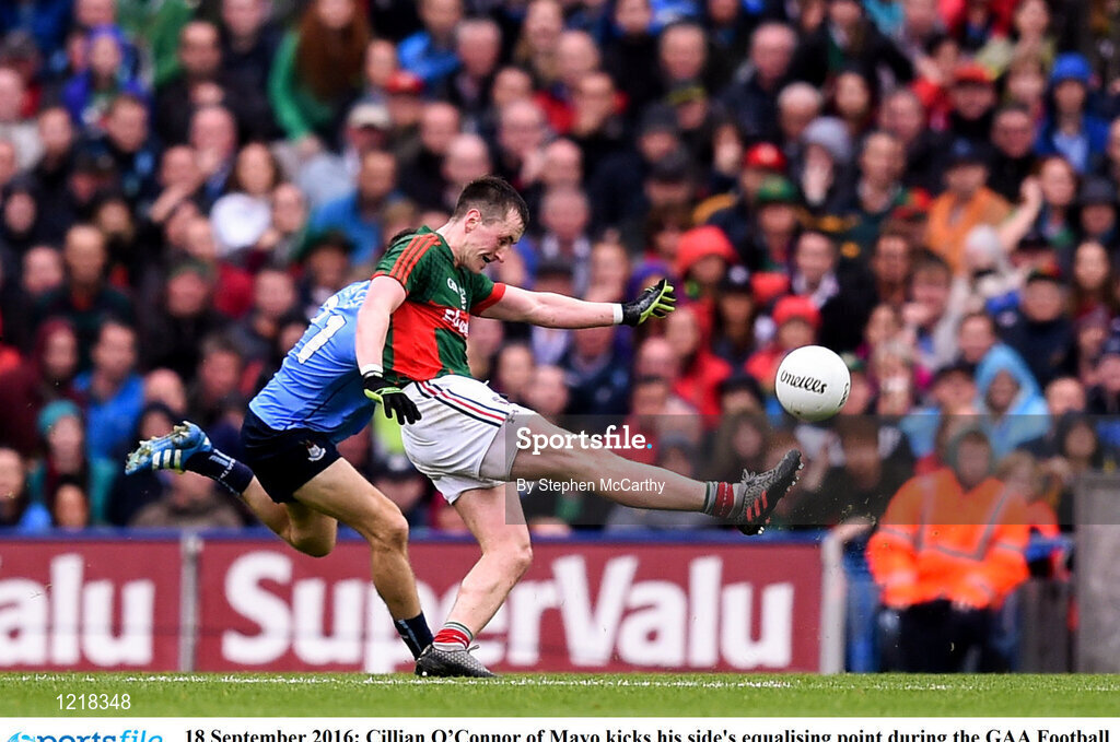 18 September 2016; Cillian O’Connor of Mayo kicks his side's equalising point during the GAA Football All-Ireland Senior Championship Final match between Dublin and Mayo at Croke Park in Dublin. Photo by Stephen McCarthy/Sportsfile