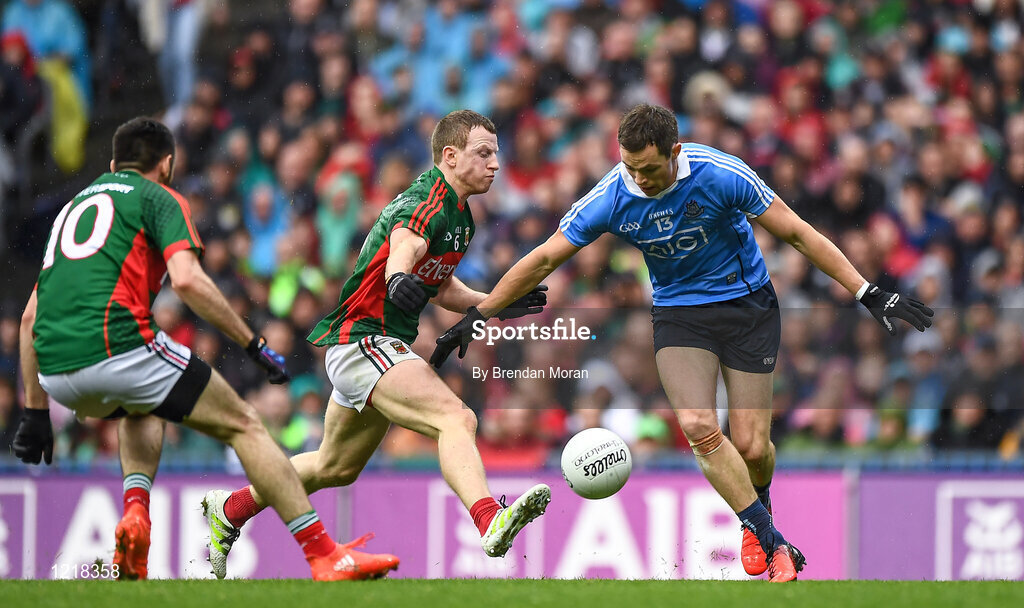 18 September 2016; Colm Boyle, second from left, of Mayo scores an own goal under pressure from Dean Rock of Dublin, Dublin's second goal of the GAA Football All-Ireland Senior Championship Final match between Dublin and Mayo at Croke Park in Dublin. Photo by Brendan Moran/Sportsfile