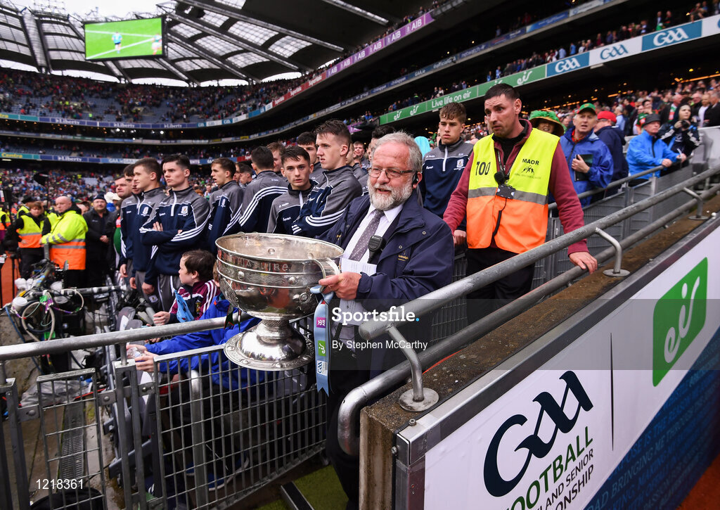 18 September 2016; Croke Park stadium announcer Jerry Grogan removes the Sam Maguire cup after the game ended in a draw during the GAA Football All-Ireland Senior Championship Final match between Dublin and Mayo at Croke Park in Dublin. Photo by Stephen McCarthy/Sportsfile