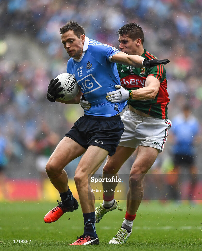 18 September 2016; Dean Rock of Dublin in action against Lee Keegan of Mayo during the GAA Football All-Ireland Senior Championship Final match between Dublin and Mayo at Croke Park in Dublin. Photo by Brendan Moran/Sportsfile