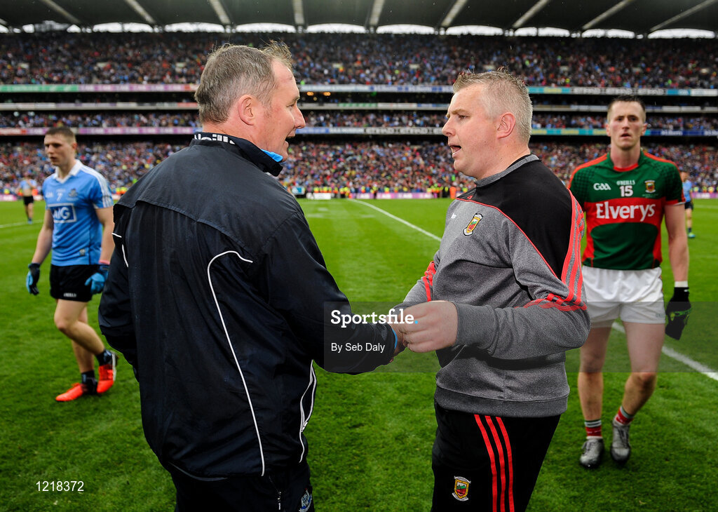 18 September 2016; Dublin manager Jim Gavin, left, and Mayo manager Stephen Rochford, right, shake hands following the GAA Football All-Ireland Senior Championship Final match between Dublin and Mayo at Croke Park in Dublin. Photo by Seb Daly/Sportsfile
