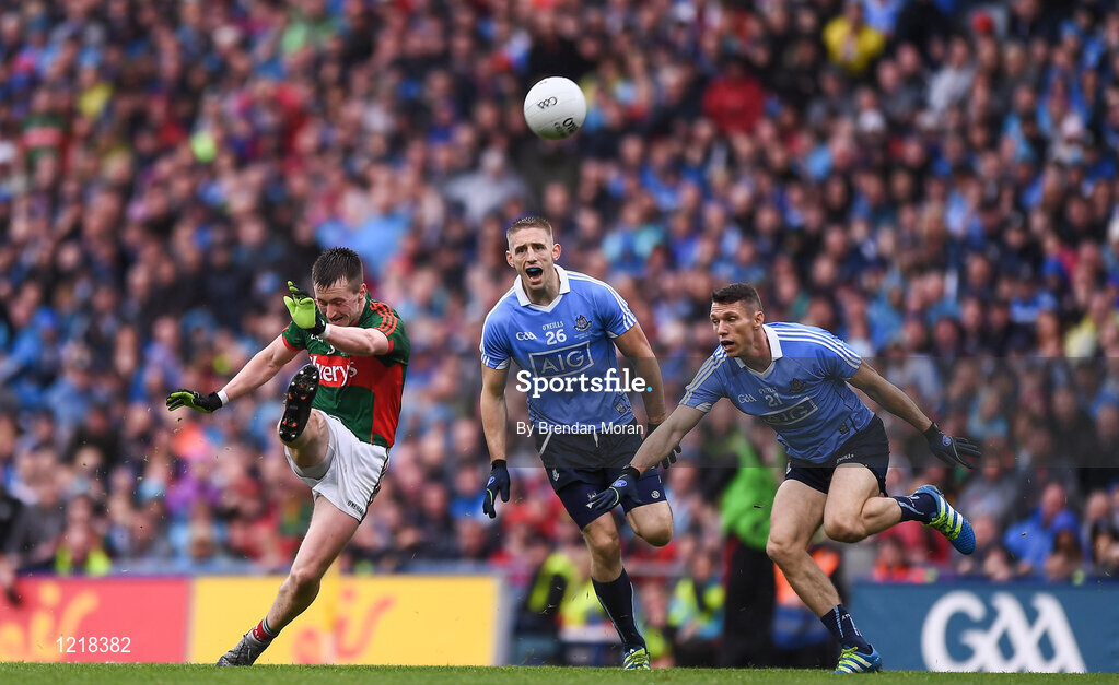 18 September 2016; Cillian O'Connor of Mayo kicks his side's equalising point despite the best efforts of Dublin players Eoghan O'Gara and Darren Daly during the GAA Football All-Ireland Senior Championship Final match between Dublin and Mayo at Croke Park in Dublin. Photo by Brendan Moran/Sportsfile
