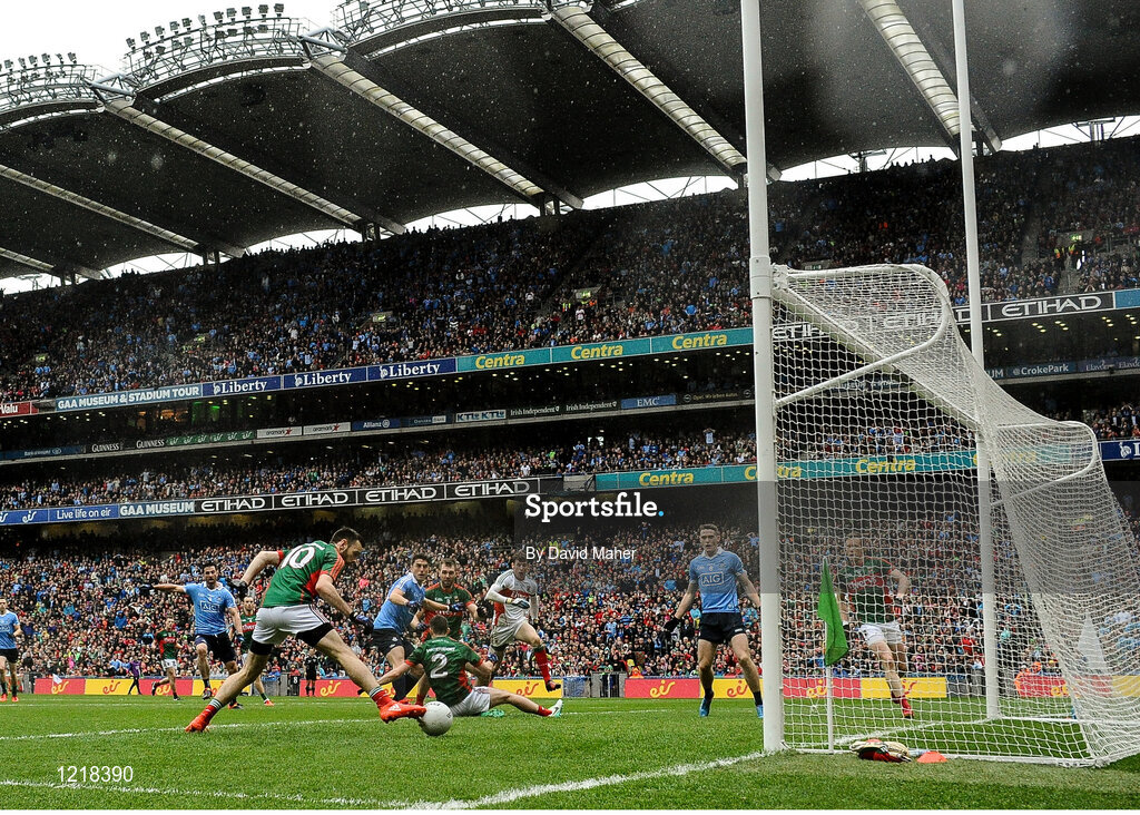 18 September 2016; The shot of Bernard Brogan of Dublin is deflected off the foot of Mayo's Kevin McLoughlin to score Dublin's first goal during the GAA Football All-Ireland Senior Championship Final match between Dublin and Mayo at Croke Park in Dublin. Photo by David Maher/Sportsfile