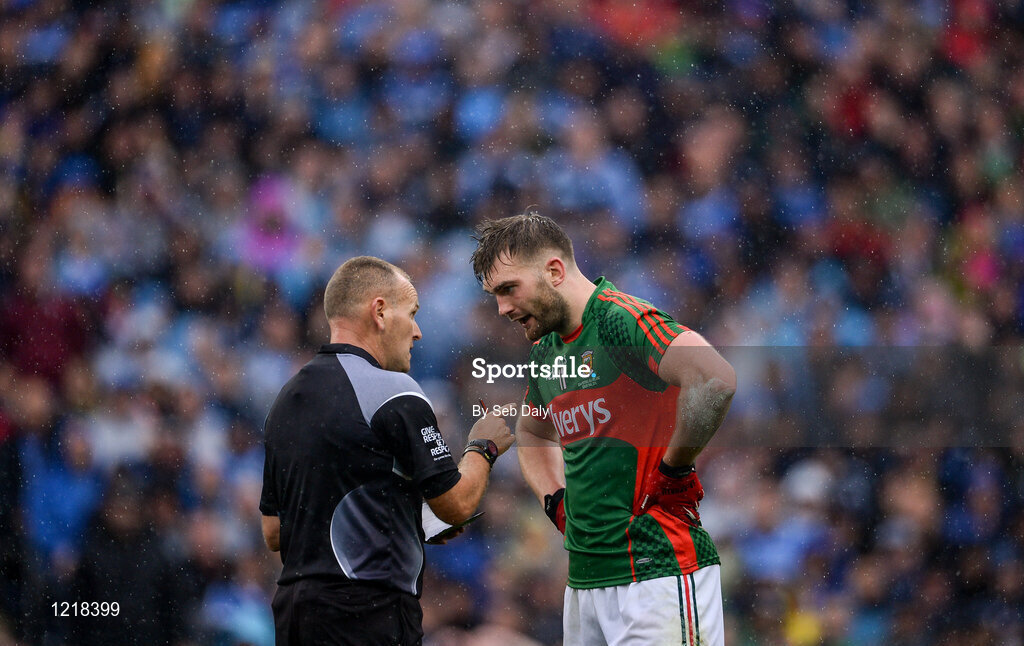 18 September 2016; Referee Conor Lane speaks to Aidan O'Shea of Mayo during the GAA Football All-Ireland Senior Championship Final match between Dublin and Mayo at Croke Park in Dublin. Photo by Seb Daly/Sportsfile
