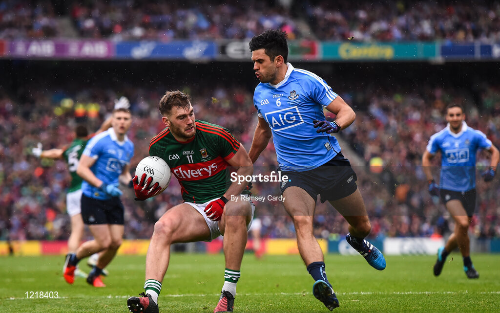 18 September 2016; Aidan O'Shea of Mayo is tackled by Cian O'Sullivan of Dublin during the GAA Football All-Ireland Senior Championship Final match between Dublin and Mayo at Croke Park in Dublin. Photo by Ramsey Cardy/Sportsfile
