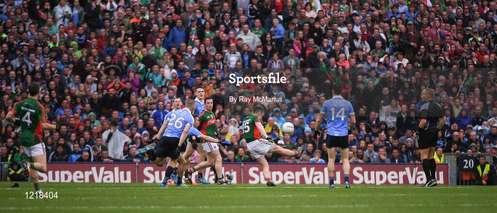 18 September 2016; Cillian O'Connor, 15, of Mayo kicks the ball over the bar for the equalising point near the end of the GAA Football All-Ireland Senior Championship Final match between Dublin and Mayo at Croke Park in Dublin. Photo by Ray McManus/Sportsfile