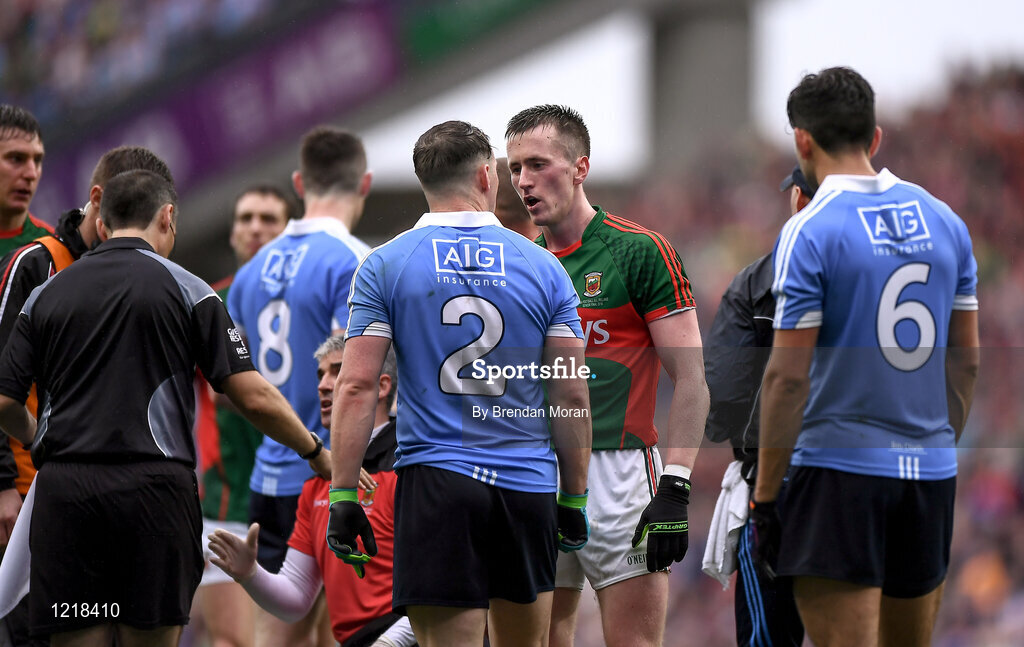 18 September 2016; Philip McMahon of Dublin and Cillian O'Connor of Mayo exchange words during the GAA Football All-Ireland Senior Championship Final match between Dublin and Mayo at Croke Park in Dublin. Photo by Brendan Moran/Sportsfile