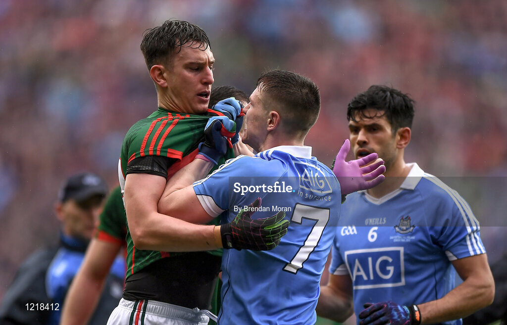18 September 2016; Barry Moran of Mayo and John Small of Dublin during the GAA Football All-Ireland Senior Championship Final match between Dublin and Mayo at Croke Park in Dublin. Photo by Brendan Moran/Sportsfile
