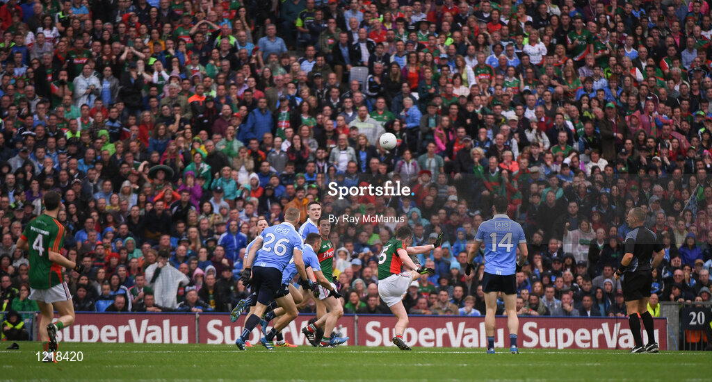 18 September 2016; Cillian O'Connor, 15, of Mayo kicks the ball over the bar for the equalising point near the end of the GAA Football All-Ireland Senior Championship Final match between Dublin and Mayo at Croke Park in Dublin. Photo by Ray McManus/Sportsfile