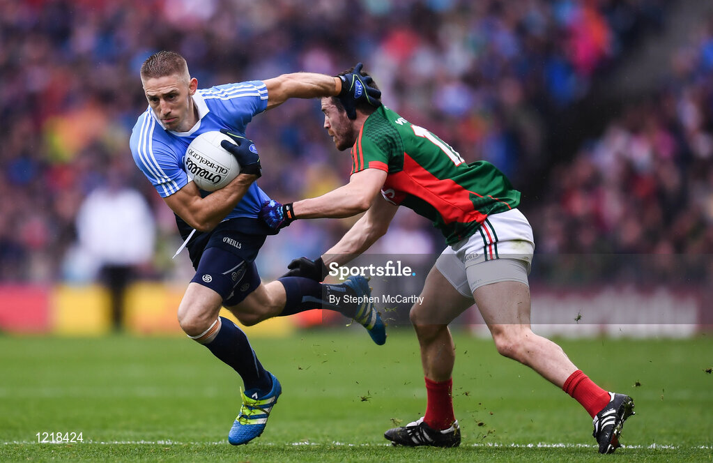 18 September 2016; Eoghan O'Gara of Dublin in action against Chris Barrett of Mayo during the GAA Football All-Ireland Senior Championship Final match between Dublin and Mayo at Croke Park in Dublin. Photo by Stephen McCarthy/Sportsfile