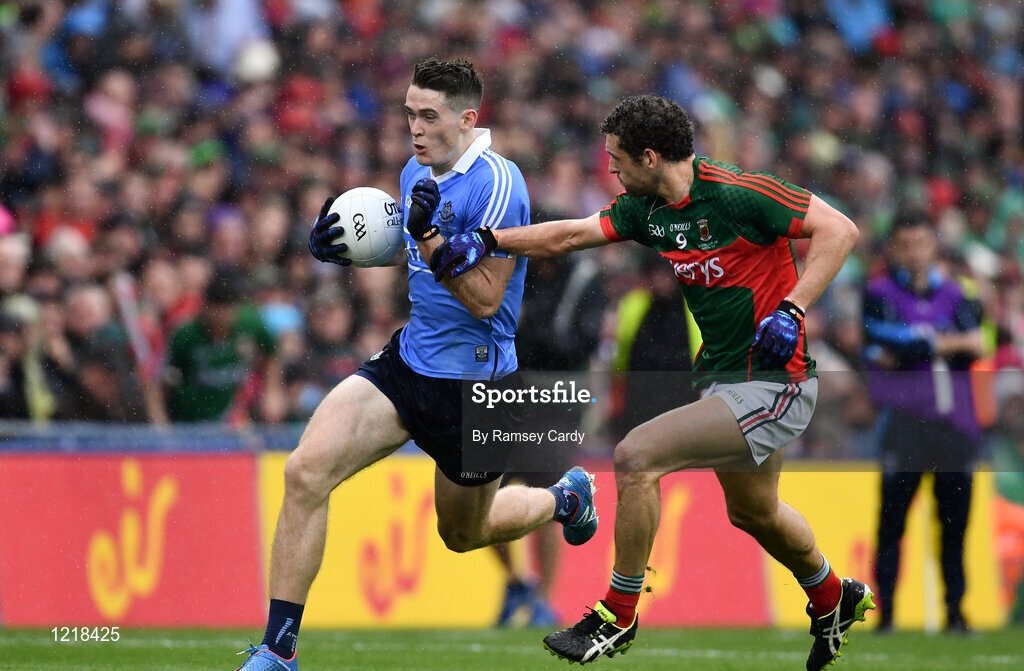 18 September 2016; Brian Fenton of Dublin is tackled by Tom Parsons of Mayo during the GAA Football All-Ireland Senior Championship Final match between Dublin and Mayo at Croke Park in Dublin. Photo by Ramsey Cardy/Sportsfile