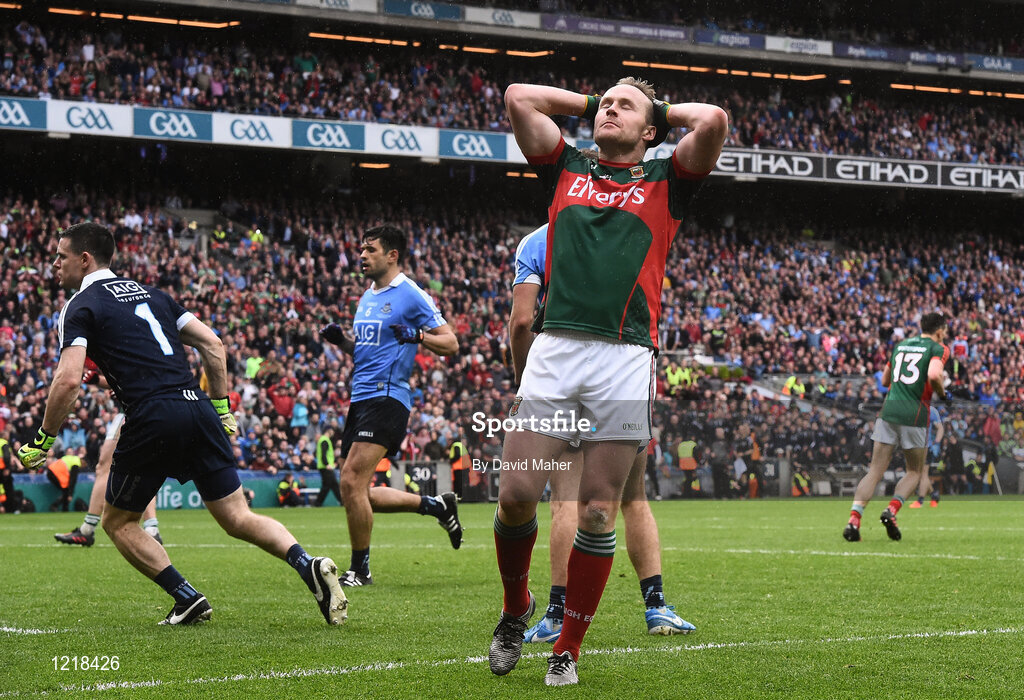 18 September 2016; Andy Moran of Mayo reacts after watching his shot go narrowly wide during the GAA Football All-Ireland Senior Championship Final match between Dublin and Mayo at Croke Park in Dublin. Photo by David Maher/Sportsfile