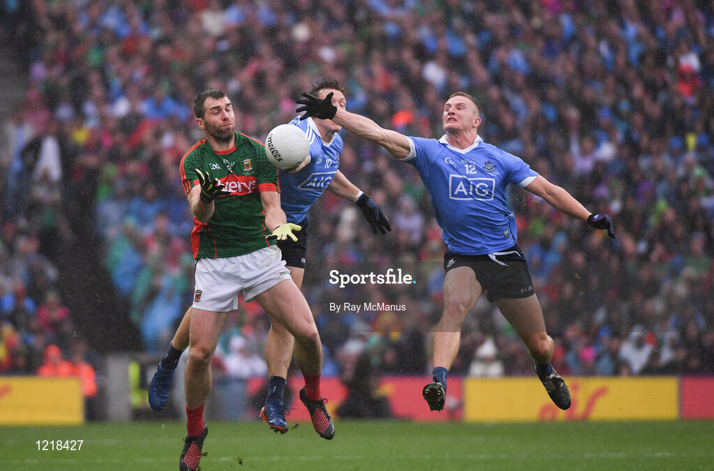 18 September 2016; Seamus O'Shea of Mayo in action against Paul Flynn and Ciarán Kilkenny of Dublin during the GAA Football All-Ireland Senior Championship Final match between Dublin and Mayo at Croke Park in Dublin. Photo by Ray McManus/Sportsfile