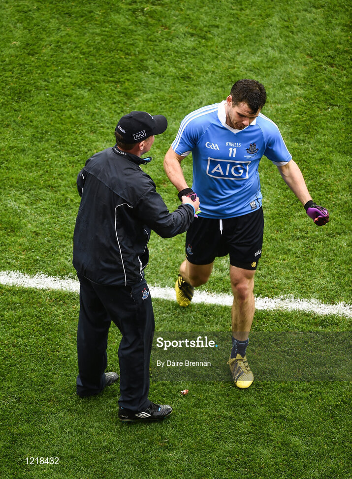 18 September 2016; Dublin manager Jim Gavin shakes hands with Kevin McManamon after McManamon was substituted during the GAA Football All-Ireland Senior Championship Final match between Dublin and Mayo at Croke Park in Dublin. Photo by Daire Brennan/Sportsfile