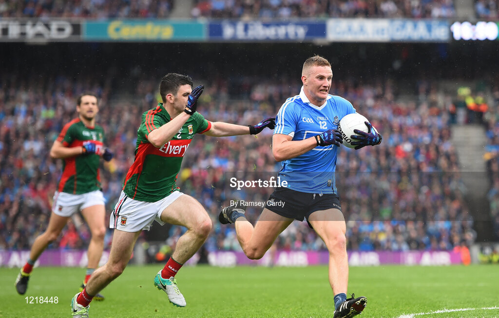 18 September 2016; Ciarán Kilkenny of Dublin is tackled by Brendan Harrison of Mayo during the GAA Football All-Ireland Senior Championship Final match between Dublin and Mayo at Croke Park in Dublin. Photo by Ramsey Cardy/Sportsfile