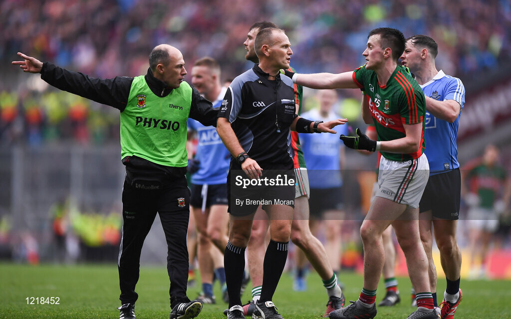 18 September 2016; Referee Conor Lane attempts to seperate Cillian O'Connor of Mayo and Philip McMahon of Dublin during the GAA Football All-Ireland Senior Championship Final match between Dublin and Mayo at Croke Park in Dublin. Photo by Brendan Moran/Sportsfile