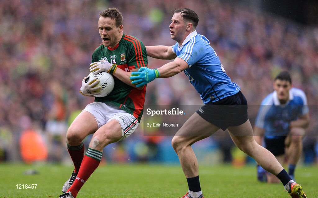18 September 2016; Andy Moran of Mayo in action against Philip McMahon of Dublin during the GAA Football All-Ireland Senior Championship Final match between Dublin and Mayo at Croke Park in Dublin. Photo by Eóin Noonan/Sportsfile