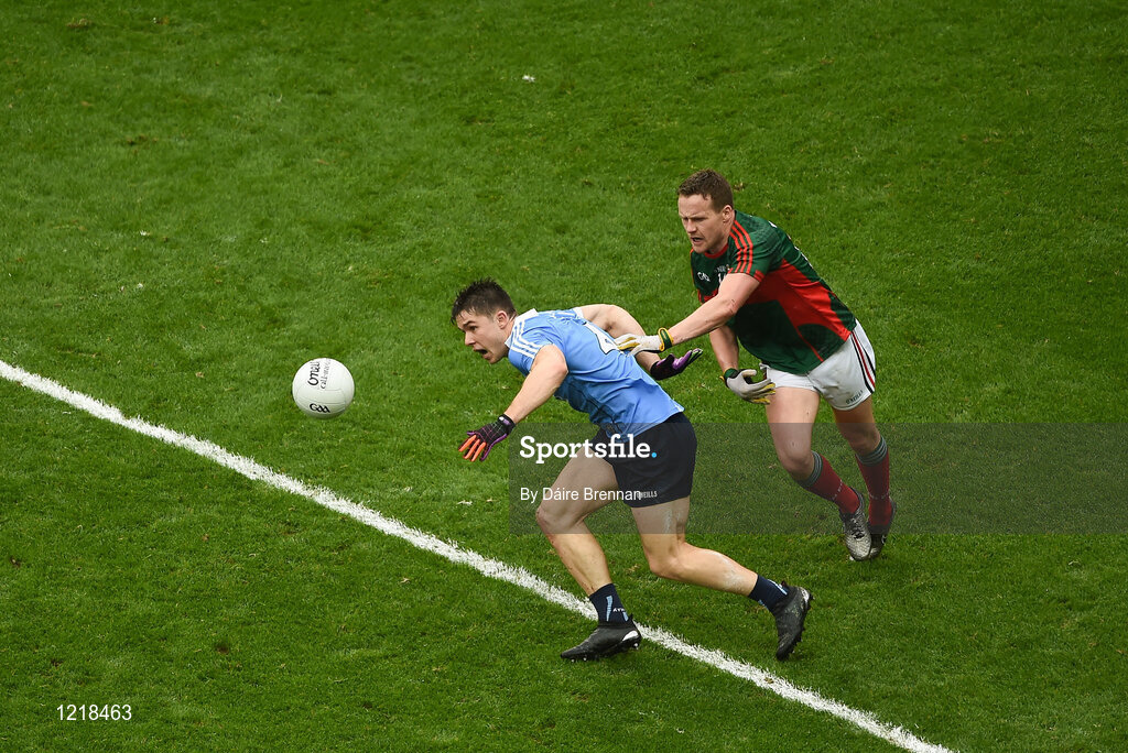 18 September 2016; David Byrne of Dublin in action against Andy Moran of Mayo during the GAA Football All-Ireland Senior Championship Final match between Dublin and Mayo at Croke Park in Dublin. Photo by Daire Brennan/Sportsfile
