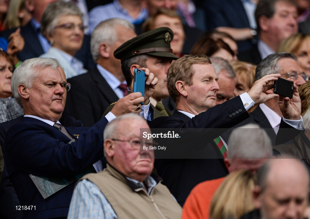 18 September 2016; Uachtarán Chumann Lúthchleas Gael Aogán Ó Fearghail, left, and An Taoiseach Enda Kenny, right, T.D. take photographs with their mobile phones ahead of the GAA Football All-Ireland Senior Championship Final match between Dublin and Mayo at Croke Park in Dublin. Photo by Seb Daly/Sportsfile