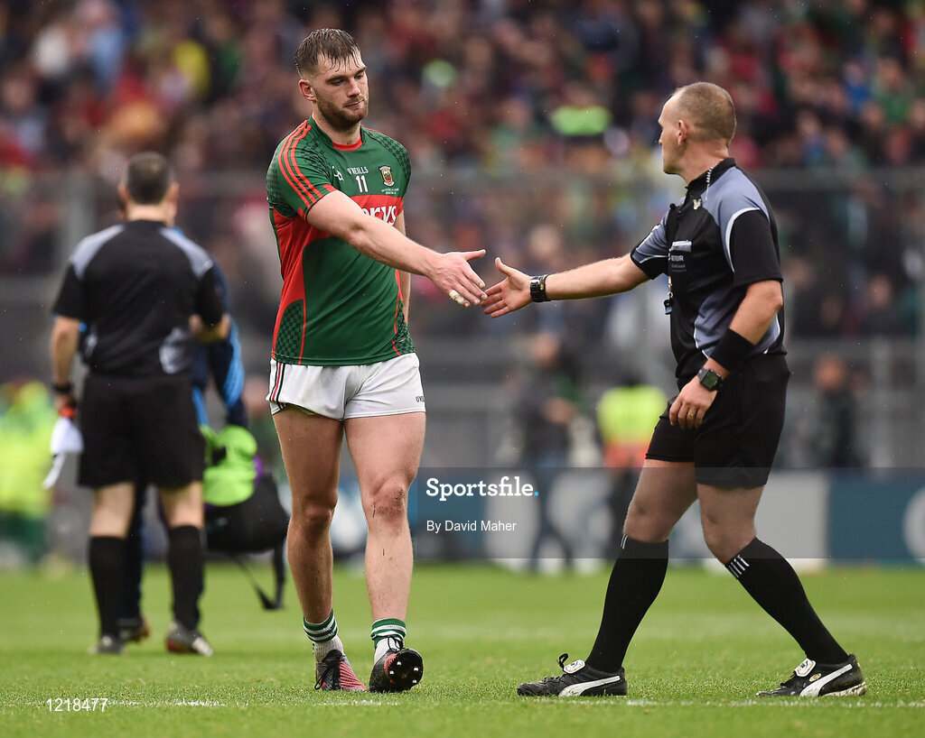 18 September 2016; Aidan O'Shea of Mayo shakes hands with referee Conor Lane at the end of the GAA Football All-Ireland Senior Championship Final match between Dublin and Mayo at Croke Park in Dublin. Photo by David Maher/Sportsfile
