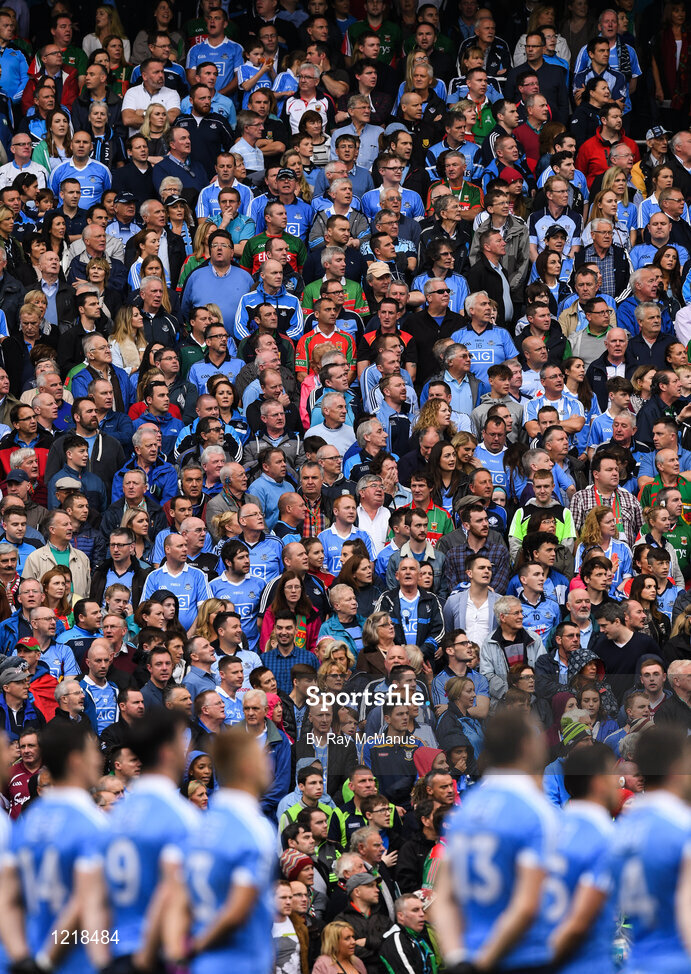 18 September 2016; Supporters in the Hogan Stand and members of the Dublin team stand for the National Anthem ahead of the GAA Football All-Ireland Senior Championship Final match between Dublin and Mayo at Croke Park in Dublin. Photo by Ray McManus/Sportsfile