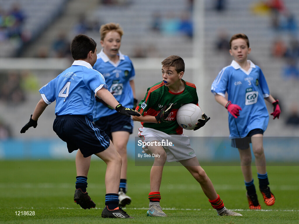 18 September 2016; Toby Lee Curran, St. Ernans BNS, Rathnew, Co. Wicklow, representing Mayo, in action against Donal Sheehan, Glenville N.S, Glenville, Co. Cork, representing Dublin, during the INTO Cumann na mBunscol GAA Respect Exhibition Go Games at the GAA Football All-Ireland Senior Championship Final match between Dublin and Mayo at Croke Park in Dublin. Photo by Seb Daly/Sportsfile