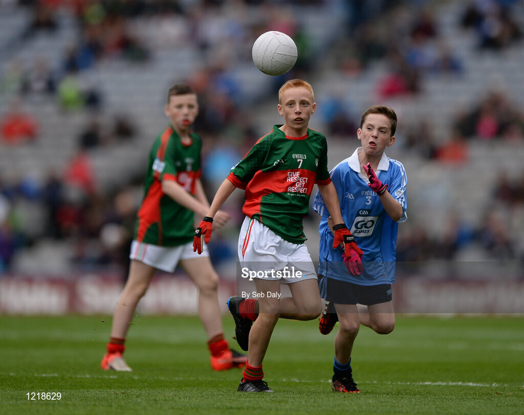 18 September 2016; Liam Leen, Scoil Mhuire, Clarinbridge, Galway, representing Mayo, in action against Eóin McElholm, St. Teresa's P.S, Loughmacrory, Omagh, Co. Tyrone, representing Dublin, during the INTO Cumann na mBunscol GAA Respect Exhibition Go Games at the GAA Football All-Ireland Senior Championship Final match between Dublin and Mayo at Croke Park in Dublin. Photo by Seb Daly/Sportsfile