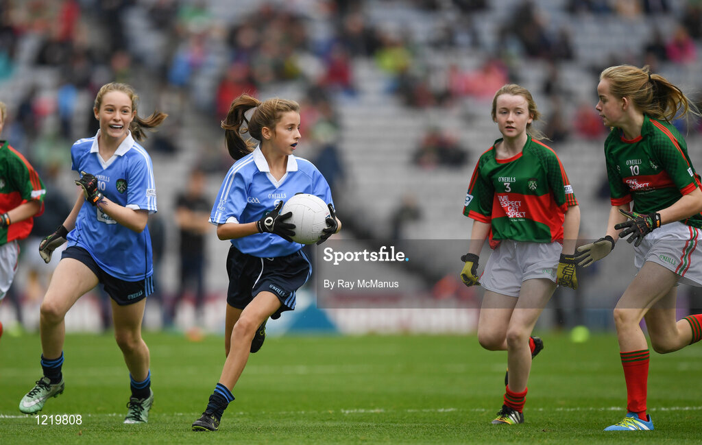 18 September 2016; Keelan Murphy, St Naile's PS, Kinawley, Fermanagh, representing Dublin, and Shaune Parker, Ballymacarbry NS, Ballymacarbry, Waterford, representing Dublin, left in action against Eimear Scullion, St Treas, Ballyronan, Derry, representing Mayo, and Maria Farrell, Ardnagrath NS, Athlone, Westmeath, representing Mayo, during the INTO Cumann na mBunscol GAA Respect Exhibition Go Games at the GAA Football All-Ireland Senior Championship Final match between Dublin and Mayo at Croke Park in Dublin. Photo by Ray McManus/Sportsfile