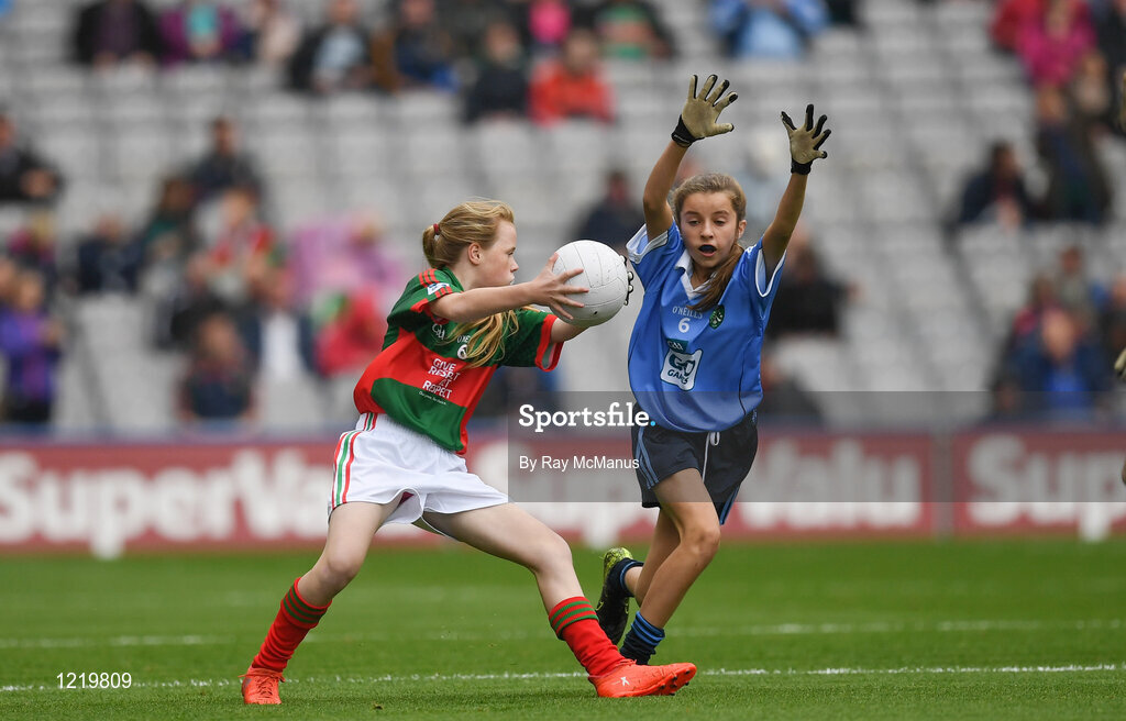 18 September 2016; Sarah Jane Reid, St Joseph's NS, Dundalk, Louth, representing Mayo, in action against Keelan Murphy, St Naile's PS, Kinawley, Fermanagh, representing Dublin, during the INTO Cumann na mBunscol GAA Respect Exhibition Go Games at the GAA Football All-Ireland Senior Championship Final match between Dublin and Mayo at Croke Park in Dublin. Photo by Ray McManus/Sportsfile