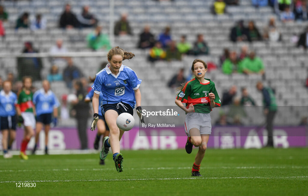18 September 2016; Shaune Parker, Ballymacarbry NS, Ballymacarbry, Waterford, representing Dublin, and Laura Casey, St Manachans NS, Mohill, Leitrim, representing Mayo, during the INTO Cumann na mBunscol GAA Respect Exhibition Go Games at the GAA Football All-Ireland Senior Championship Final match between Dublin and Mayo at Croke Park in Dublin. Photo by Ray McManus/Sportsfile