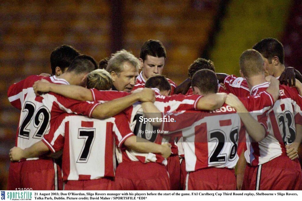 21 August 2003; Don O'Riordan, Sligo Rovers manager with his players before the FAI Carlsberg Cup Third Round replay between Shelbourne and Sligo Rovers at Tolka Park, Dublin. Picture credit; David Maher / SPORTSFILE