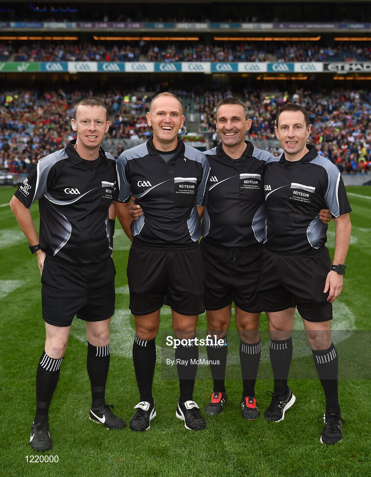 18 September 2016; Referee Conor Lane, second from left, and his officials Joe McQuillan, left, Maurice Deegan and Derek O'Mahoney, right, before the GAA Football All-Ireland Senior Championship Final match between Dublin and Mayo at Croke Park in Dublin. Photo by Ray McManus/Sportsfile