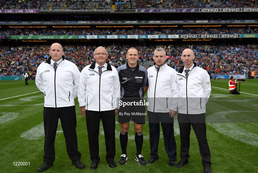 18 September 2016; Referee Conor Lane and his umpires John Joe Lane, DJ O'Sullivan, Ray Hegarty and Pat Kelly before the GAA Football All-Ireland Senior Championship Final match between Dublin and Mayo at Croke Park in Dublin. Photo by Ray McManus/Sportsfile