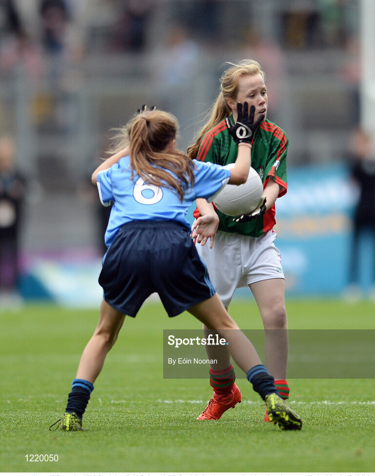 18 September 2016; Sarah Jane Reid, St Joseph's NS, Dundalk, Louth, representing Mayo, in action against Keelan Murphy, St Naile's PS, Kinawley, Fermanagh, representing Dublin, during the INTO Cumann na mBunscol GAA Respect Exhibition Go Games at the GAA Football All-Ireland Senior Championship Final match between Dublin and Mayo at Croke Park in Dublin. Photo by Eóin Noonan/Sportsfile