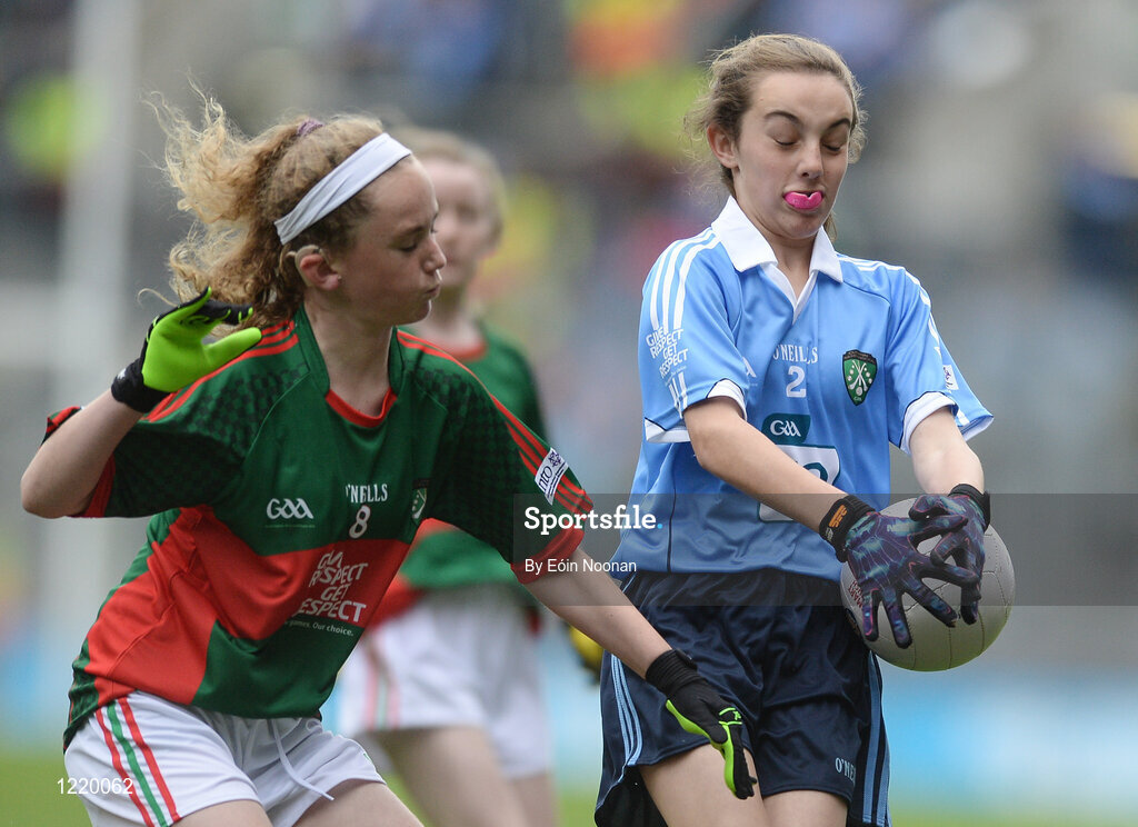 18 September 2016; Rachel O'Brien, Newtown Dunleckney, Bagenalstown, Carlow, representing Dublin, in action against Aisling Hanly, Roxboro NS, Derrane, Roscommon, representing Mayo, during the INTO Cumann na mBunscol GAA Respect Exhibition Go Games at the GAA Football All-Ireland Senior Championship Final match between Dublin and Mayo at Croke Park in Dublin. Photo by Eóin Noonan/Sportsfile
