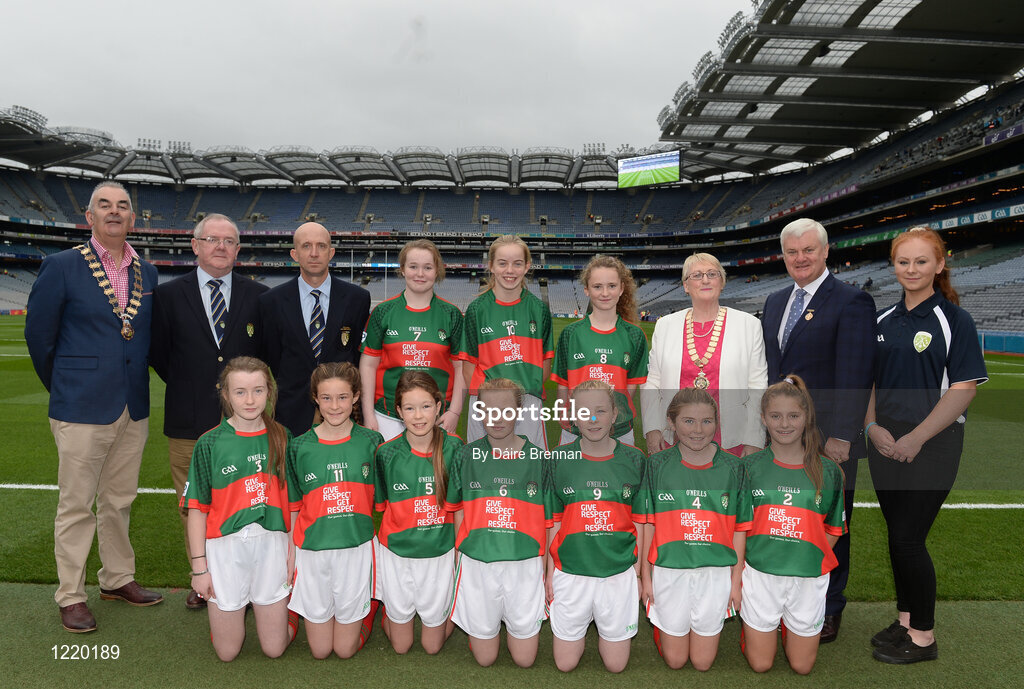 18 September 2016; Vice President of the INTO John Boyle, Mini-Sevens Coordinator Gerry O'Meara, President of Cumann na mBunscol Liam McGee, INTO President Rosena Jordan, Uachtarán Chumann Lúthchleas Gaeil Aogán Ó Fearghail, with the Mayo team, back row, left to right, Aoibheann Corcoran, Moynalvey NS, Summerhill, Meath, Maria Farrell, Ardnagrath NS, Athlone, Westmeath, Aisling Hanly, Roxboro NS, Derrane, Roscommon, front row, left to right, Eimear Scullion, St Treas, Ballyronan, Derry, Róisín Ní Bhriain, Gaelscoil na Cruaiche, Westport, Mayo, Laura Casey, St Manachans NS, Mohill, Leitrim, Sarah Jane Reid, St Joseph's NS, Dundalk, Louth, Nadine Hargadon, Cloghogue NS, Castlebaldwin, Sligo, Shonagh Fitzpatrick, St Finian's Waterville, Kerry, Sophie Thompson, Scoil Maria Assumpta, Ballyphehane, Cork, ahead of the GAA Football All-Ireland Senior Championship Final match between Dublin and Mayo at Croke Park in Dublin. Photo by Daire Brennan/Sportsfile