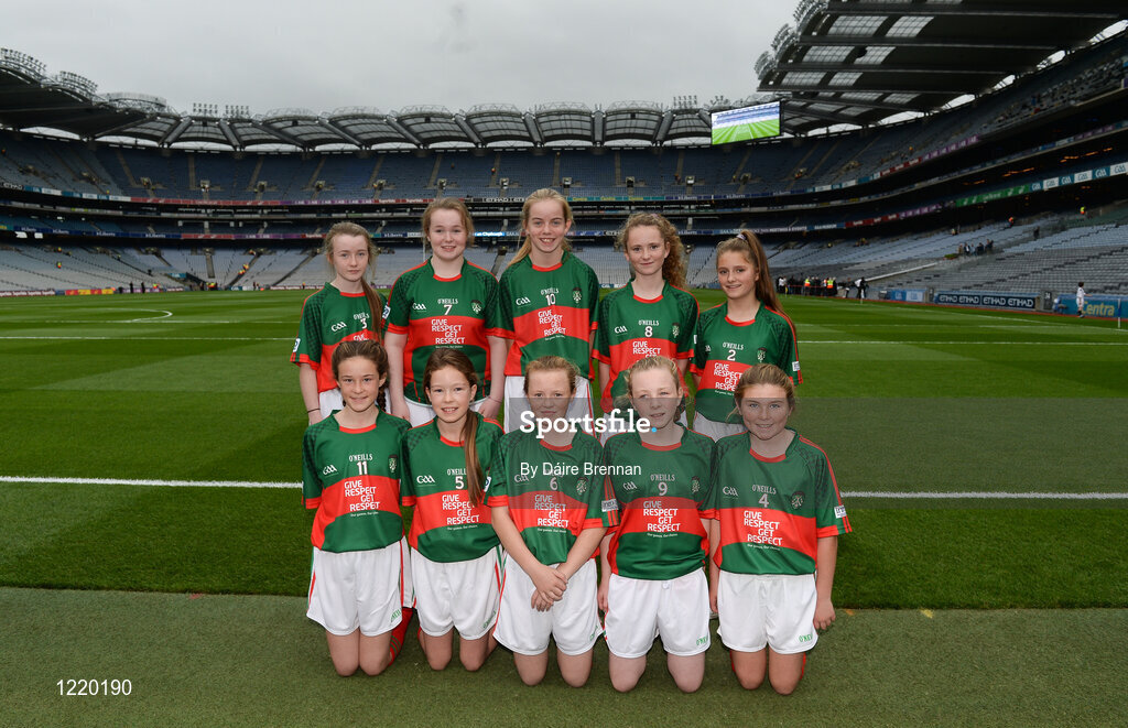 18 September 2016; The Mayo team, back row, left to right, Eimear Scullion, St Treas, Ballyronan, Derry, Aoibheann Corcoran, Moynalvey NS, Summerhill, Meath, Maria Farrell, Ardnagrath NS, Athlone, Westmeath, Aisling Hanly, Roxboro NS, Derrane, Roscommon, Scoil Maria Assumpta, Ballyphehane, Cork, front row, left to right, Róisín Ní Bhriain, Gaelscoil na Cruaiche, Westport, Mayo, Laura Casey, St Manachans NS, Mohill, Leitrim, Sarah Jane Reid, St Joseph's NS, Dundalk, Louth, Nadine Hargadon, Cloghogue NS, Castlebaldwin, Sligo, Shonagh Fitzpatrick, St Finian's Waterville, Kerry, Sophie Thompson, ahead of the GAA Football All-Ireland Senior Championship Final match between Dublin and Mayo at Croke Park in Dublin. Photo by Daire Brennan/Sportsfile