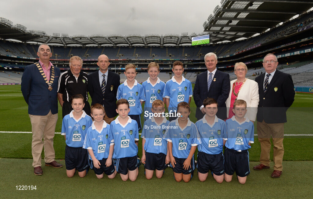 18 September 2016; Vice President of the INTO John Boyle, President of Cumann na mBunscol Liam McGee, Uachtarán Chumann Lúthchleas Gaeil Aogán Ó Fearghail, INTO President Rosena Jordan, Mini-Sevens Coordinator Gerry O'Meara, with the Dublin team, back row, left to right, Cian Cunningham, Carrick PS, Burren, Down, Tom Coleman, Two Mile House NS, Naas, Kildare, Oisín Hooney, Ballyadams NS, Ballyadams, Laois, front row, left to right, Darragh O'Dowd, Baile Eóin BNS, Dún Laoghaire, Dublin, Odhran Harbinson, St Patrick's PS, Derrygonnelly, Fermanagh, Eóin McElholm, St Teresa's PS, Loughmacrory, Omagh, Tyrone, Evan O'Leary, Lisnagry NS, Lisnagry, Limerick, Cillian Hackett, St Canices Co Ed, Granges Road, Kilkenny, Donal Sheehan, Glenville NS, Glenville, Cork, Oisín Rooney, Drimnagh Castle, Walkinstown, Dublin, ahead of the GAA Football All-Ireland Senior Championship Final match between Dublin and Mayo at Croke Park in Dublin. Photo by Daire Brennan/Sportsfile