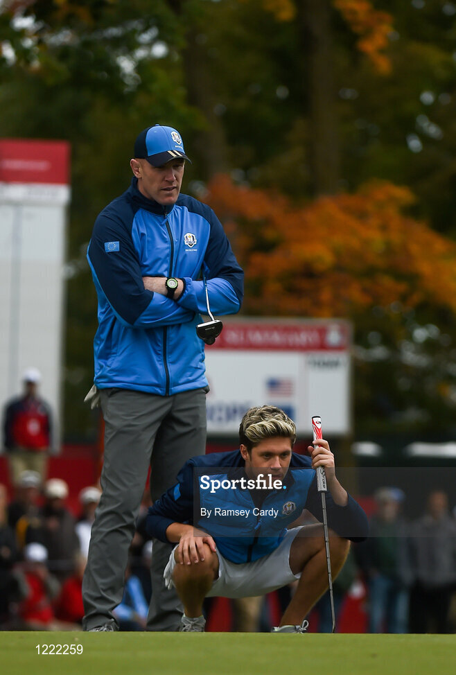 27 September 2016; Singer Niall Horan, below, and Former Ireland and Munster rugby player Paul O’Connell of Europe during the Celebrity Matches at The 2016 Ryder Cup Matches at the Hazeltine National Golf Club in Chaska, Minnesota, USA. Photo by Ramsey Cardy/Sportsfile