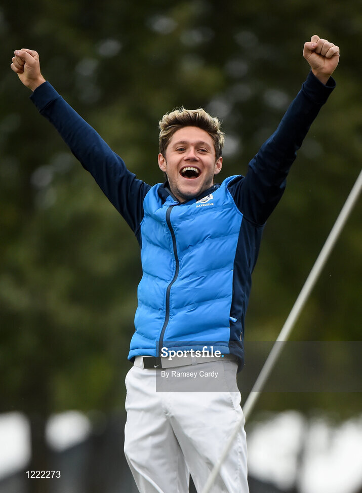 27 September 2016; Niall Horan celebrates a missed USA putt which resulted in a drawn match in the Celebrity Matches at The 2016 Ryder Cup Matches at the Hazeltine National Golf Club in Chaska, Minnesota, USA. Photo by Ramsey Cardy/Sportsfile
