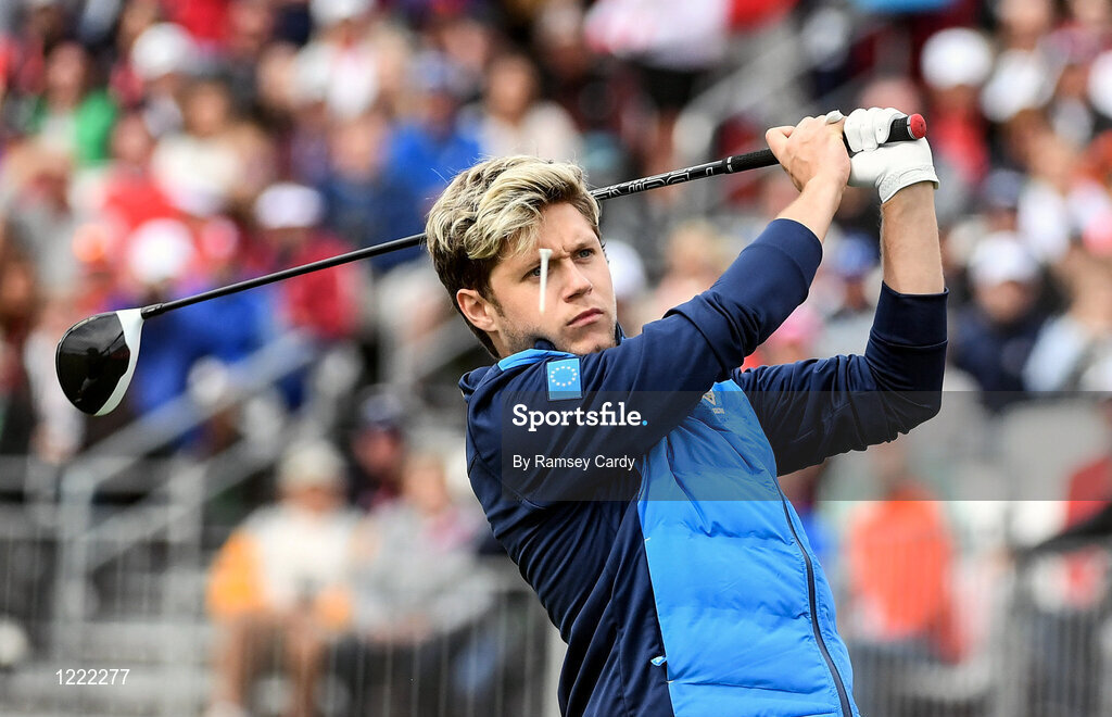27 September 2016; One Direction singer Niall Horan watches his drive from the 1st tee box before their round of the Celebrity Matches at The 2016 Ryder Cup Matches at the Hazeltine National Golf Club in Chaska, Minnesota, USA. Photo by Ramsey Cardy/Sportsfile