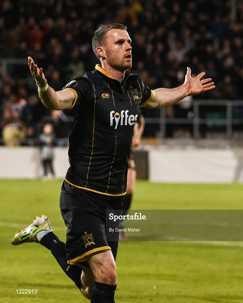 29 September 2016; Ciaran Kilduff of Dundalk celebrates after scoring his side's first goal during the UEFA Europa League Group D match between Dundalk and Maccabi Tel Aviv at Tallaght Stadium in Tallaght, Co. Dublin. Photo by David Maher/Sportsfile